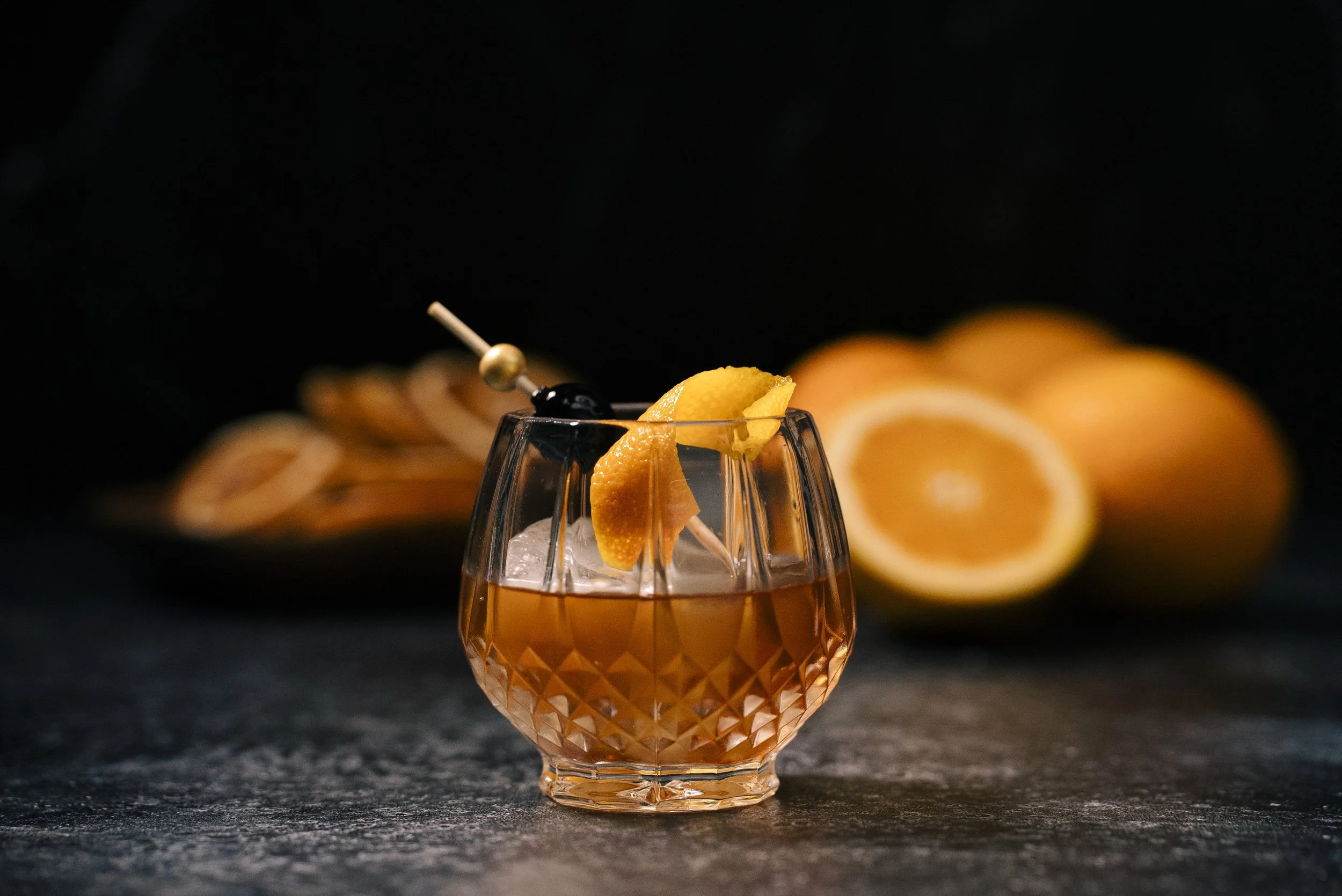 Garnished with a Luxardo Cherry and Orange Peel