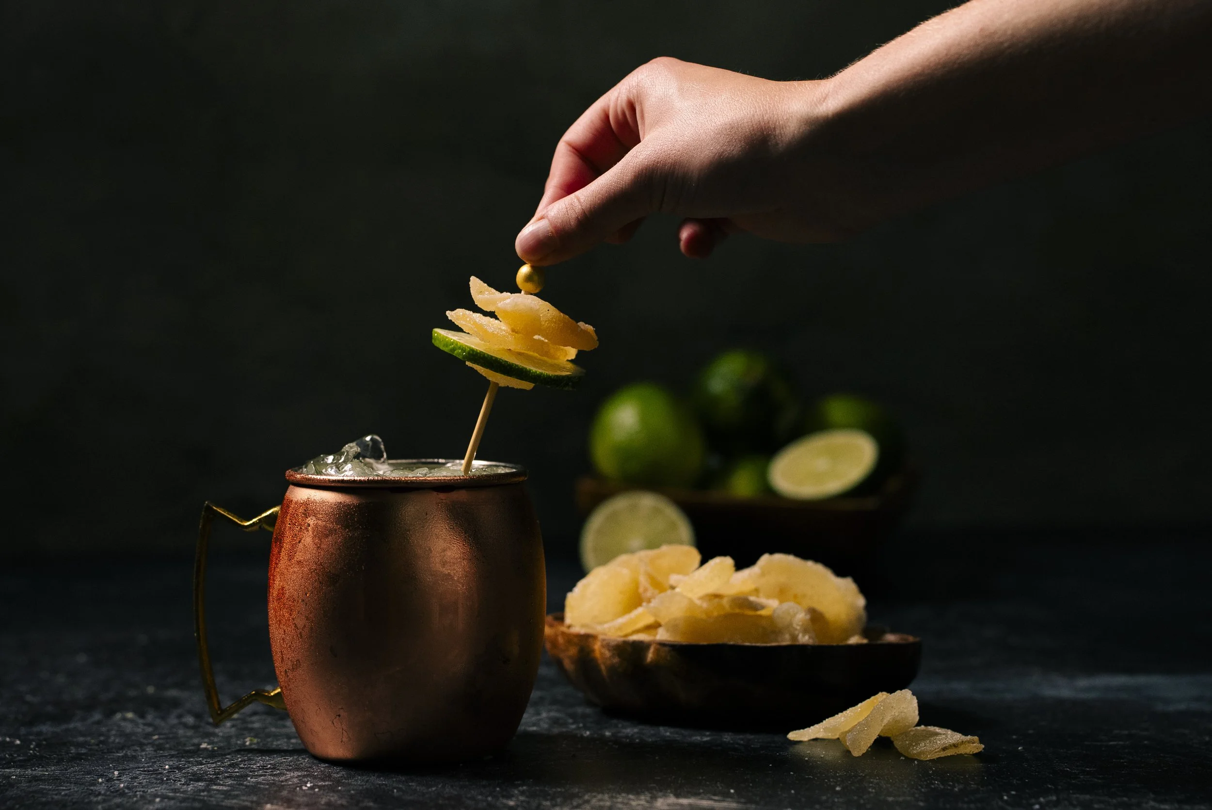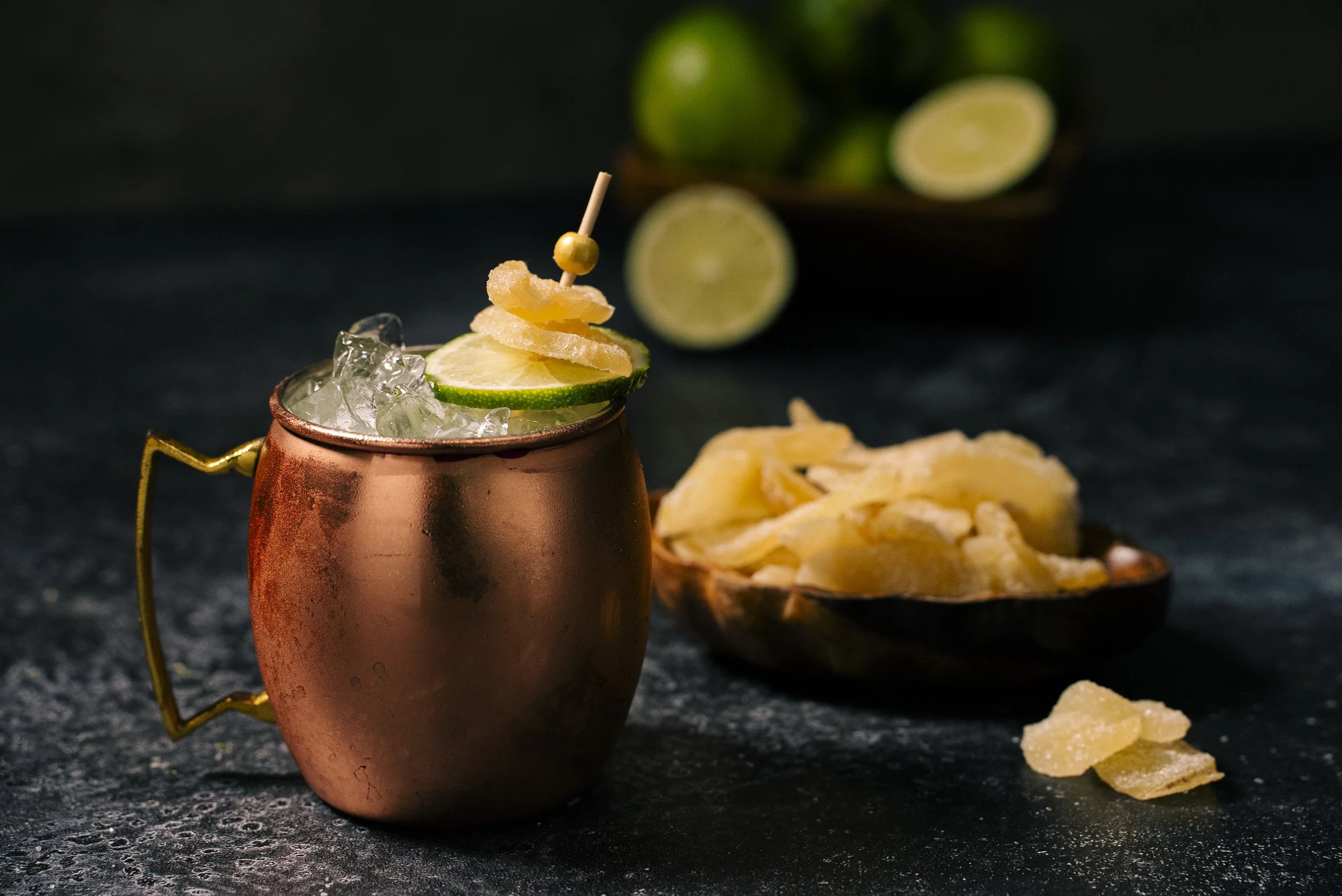 Garnished with a Skewered Candied Ginger and Lime wheel